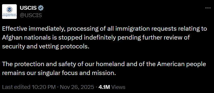 December 26, 2025USCIS announced on X that, "Effective immediately, processing of all immigration requests relating to Afghan nationals is stopped indefinitely pending further review of security and vetting protocols." The announcement follows the shooting of two National Guard members in Washington, D.C. allegedly carried out by an Afghan national.